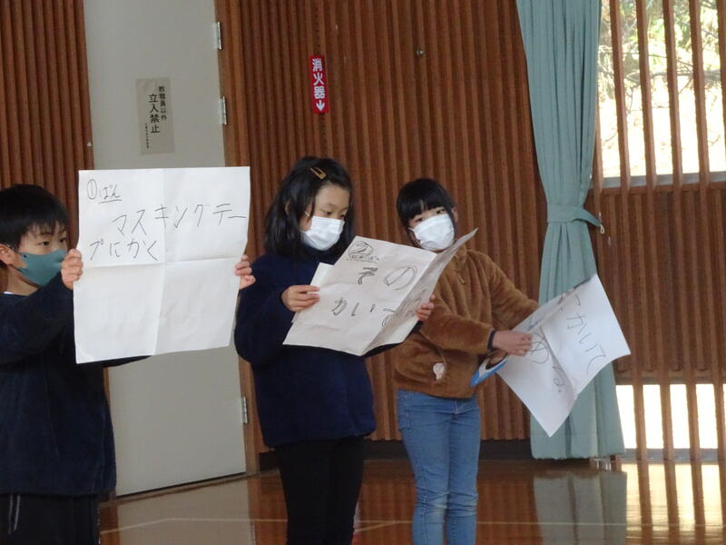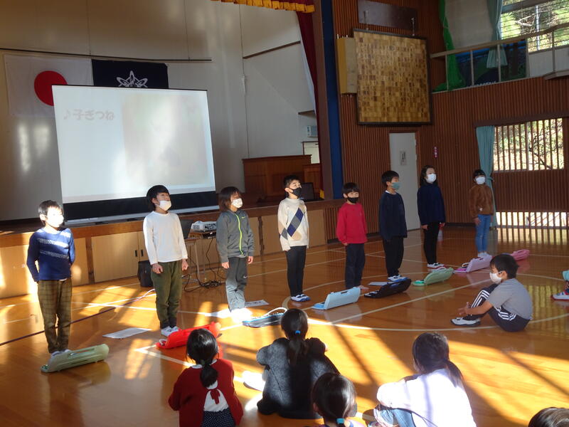 今日は火曜日、集会は「やまびこ集会」でした。今日の発表は2年生!! 町探検で知ったことをクイズにして発表しました!! 「こぎつね」の歌と鍵盤ハーモニカの演奏がとても上手でした
