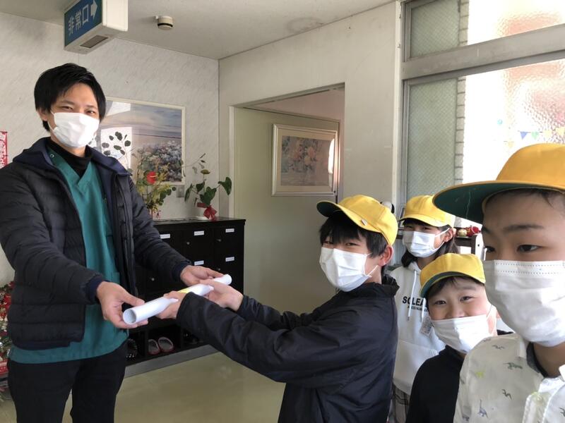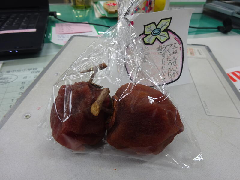 1、2年生が作った「干し柿」を学校のみんなにプレゼントしてくれました!! とてもおいしそうな干し柿です