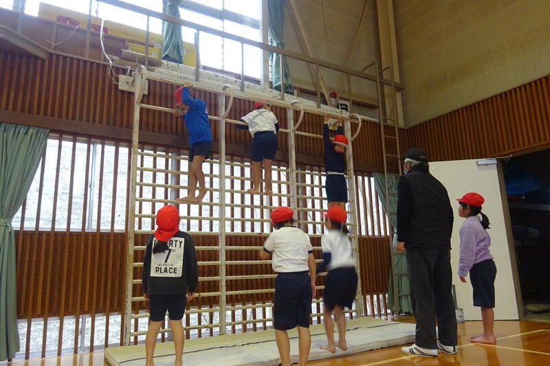 1、2年生は体育で「忍者の修行」をしました!! 忍者先生の鋤﨑先生にご指導いただいて、”かべのぼりの修行”をしましたよ