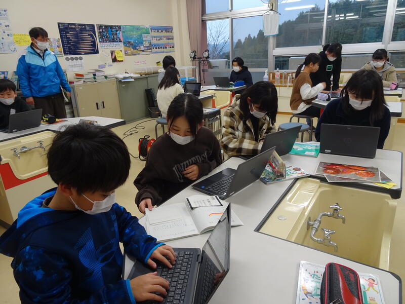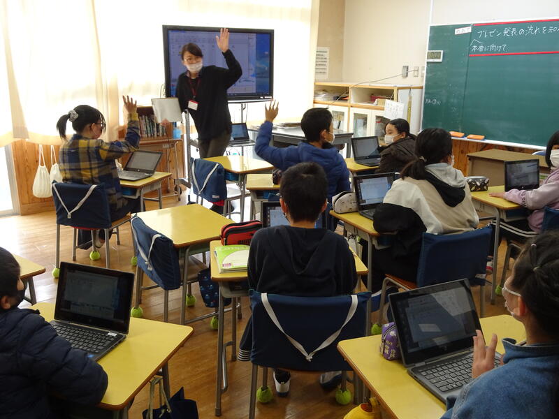 5年生は総合の時間にプレゼンソフトの使い方を学んでいました! 水俣学習で学んだことを各々でまとめ、それを発表する準備です