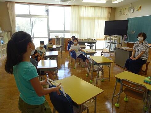 始業式は多目的室から各教室へオンラインで実施。各学年の代表1名が「夏休みの思い出と2学期頑張ること」を発表しました。夏休みにいろいろな体験ができたようです。2学期は運動会に向けて頑張りたいという意気込みも感じました。また、絵画展やがあーっぱ祭ポスター、天草市恐竜絵画コンテストの表彰も行いました。