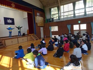 児童集会では健康給食委員会が発表しました。給食週間にちなんで「赤・黄・緑の食品をバランスよく食べよう」と呼びかけました。3色レンジャーも登場して説得力がありました。各学年からは「私は黄色の食品をもっと食べてバランスよくしたいと思いました。」などの感想が聞かれました。日頃の感謝を込めて、給食室の農中先生と村本先生に全校児童で「ありがとうございます」を伝えました。