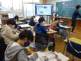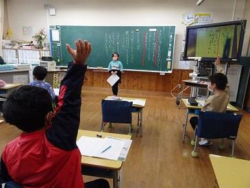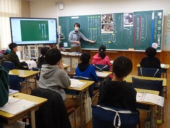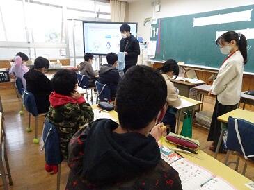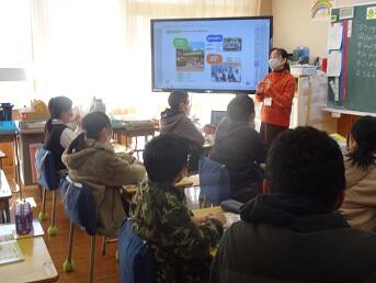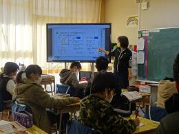 6年生の3学期は中学0年生として自覚をもって学校生活を送っています。1校時算数は学習のしあげです。図形の問題を各自で解き、皆で答え合わせをしました。電子黒板を使うと図形が提示しやすく、書き込みもできて効率よく学習できます。2校時は英語指導の齊賀先生と「外国の小学校」「My best memory.」「学校の自慢」を学習しました。いろいろな国の休日やランチなど日本との違いに驚いていました。齊賀先生のSchool Tripの思い出を英語で聞き取り「Excellent!」「Good!」と何度も褒められました。学校自慢では伝統芸能や芝生の運動場、給食室などを何とか英語で伝えようとして、笑顔が絶えない英語の時間でした。