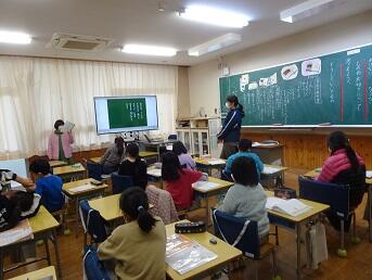 4年は外国の小学校の紹介を英語で聞き、日本と外国の学校の違いを知りました。ElementarySchool、Violin、Play等、聞き取れる単語が増え、発音も真似てできています。5年では、日本の季節の風習などを英語で紹介する文を考えていました。