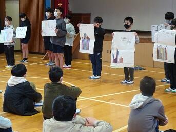 木曜集会では体育環境委員会がSDGsについて発表しました。毎月の電気、水道、ごみの量のグラフを示し、資源を大切にしていきましょうと呼びかけました。聞いた児童からは「家庭での節電」「学校でのごみ」についての気付きや感想が出ていました。みんなの関心をひきつける分かりやすい発表で、SDGsについて楽しく学ぶことができました!