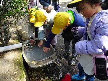 1年生活科では校外学習で鼎春園の冬の様子を調べに行きました。手水鉢の水の冷たさ、梅の木の蕾などに気付いたようです。寒さの中に春が近づいていることを発見できました。