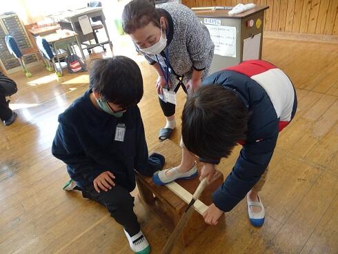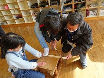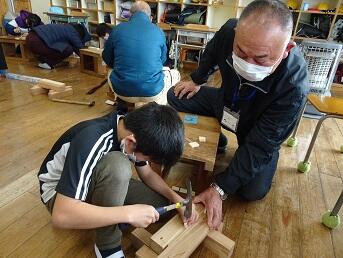 4年図工「トントンつないで」に学校応援団(七滝地区)が来てくださいました!何と本物の大工さんがのこぎりで切る時の台座を作ってもってきてくださるなど、子供たちの活動を大いに助けてくださいました。のこぎりと金槌を使って作る楽しさを十分に味わいました。