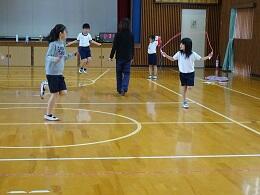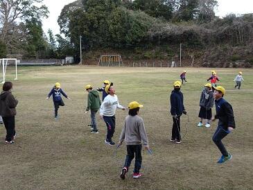 1年体育では終わりの10分間で「なわとび大会」をしていました。3年生が1年生の跳ぶ回数を数えたり、あや跳びを教えたりしました。「かけ足跳びはこうするよいいよ」と3年生がお手本を見せながら優しく教えていました。異学年で教え合うことができる関係ができているのも本校の良さだと感じます。