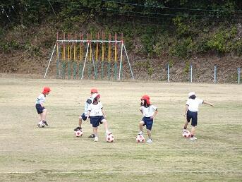 1年体育「ボールゲーム」では、緒方先生はいろいろな方法で子供たちがボール操作に慣れるよう指導していました。友だちと接触しないようにボールを蹴ったり、笛の合図でボールを止めたりしていました。