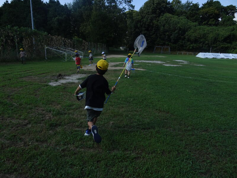 子供たちは虫取り網やかごをもって芝生の運動場を走り回っています。