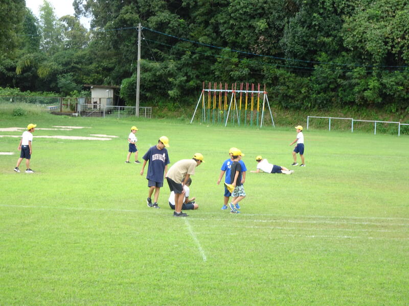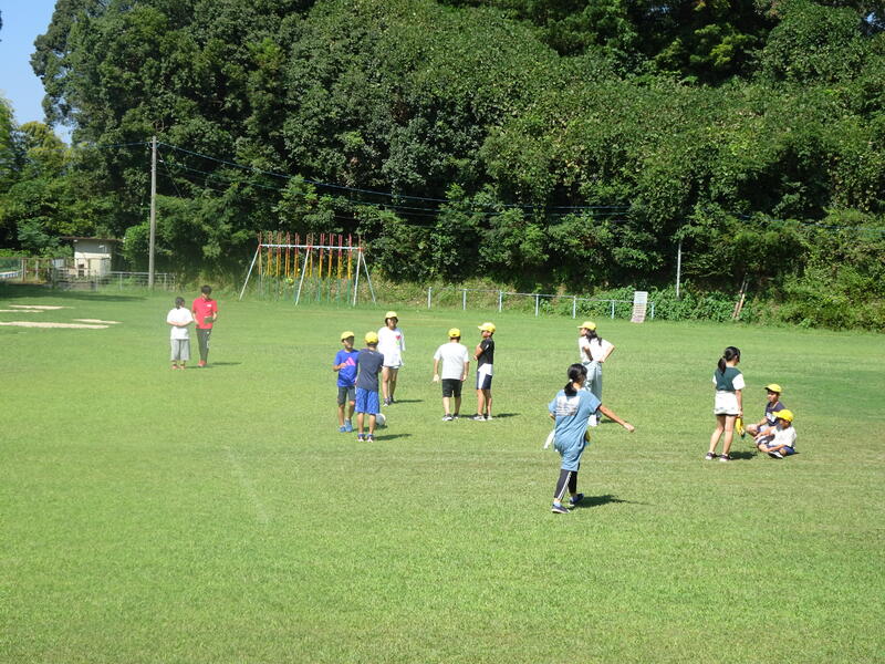 芝生の運動場だからこそのよさもたくさんあります。芝生の上で座り込んで休むこともできます。
