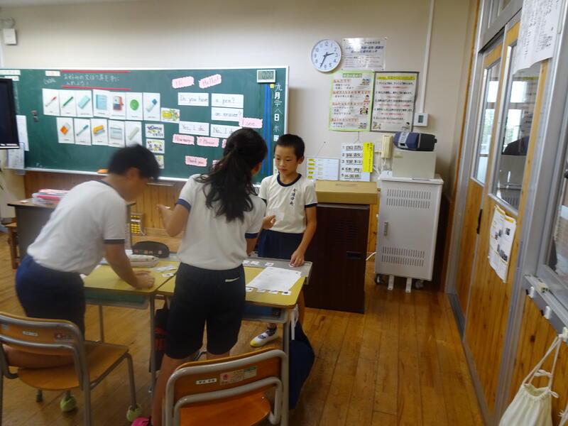 子供たちは、「Do you have a ~?」など、自分が手に入れたい文房具について尋ねたり答えたりする活動を通して、ジェスチャーなどもまじえながら楽しく活動をすることができました。