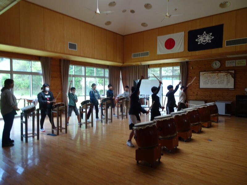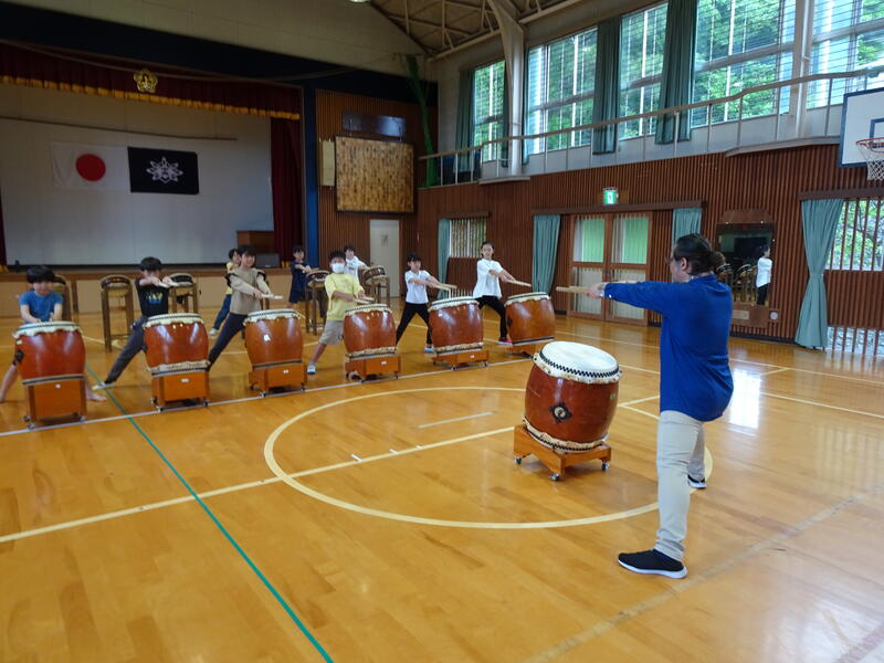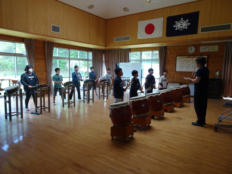 また、5月12日の七滝滝祭りに向けて、6年生が新風太鼓「響」の練習を始めました。担任の桑原先生から「まずは一つ一つ丁寧に」という指導で、太鼓の練習をしています。