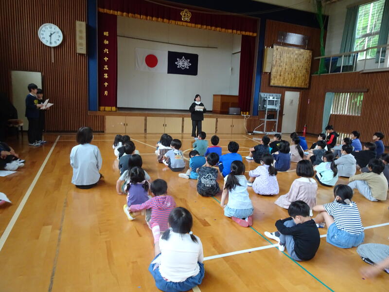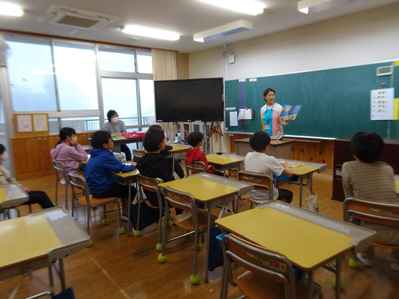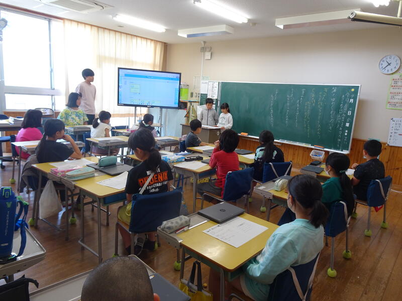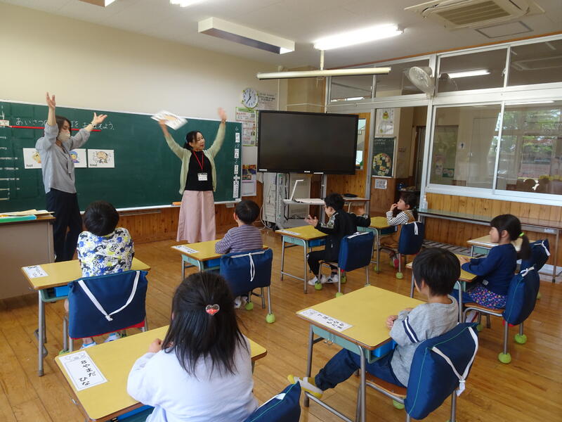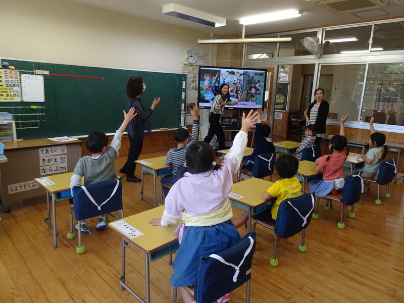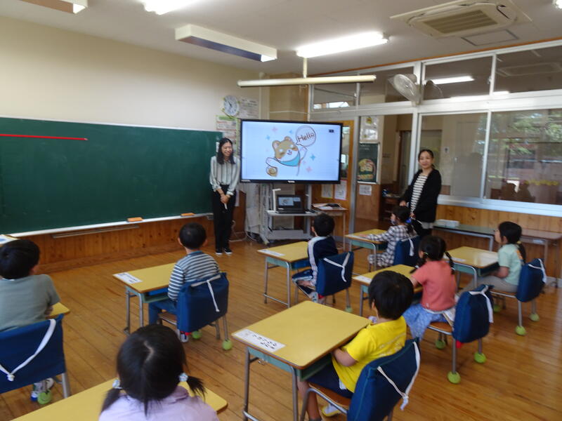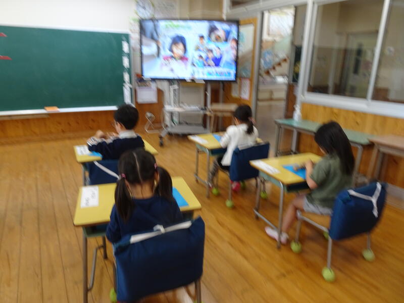 また、4時間目1年生がはじめての英語活動をしました。「あいさつをしよう」ということで、英語であいさつをしました。とても楽しく活動した1年生です。