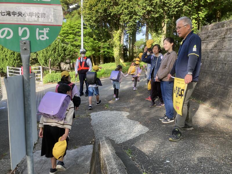 また、新しくこられた駐在所の髙木さんは毎朝立っていただいています。地域の方に守られている七滝中央っ子です。
