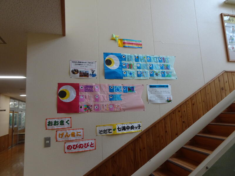 なかよしと1年生が作った鯉のぼりが階段に飾ってあります。