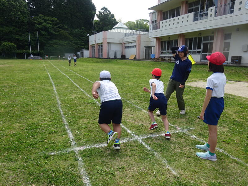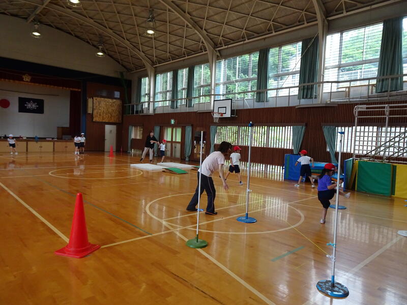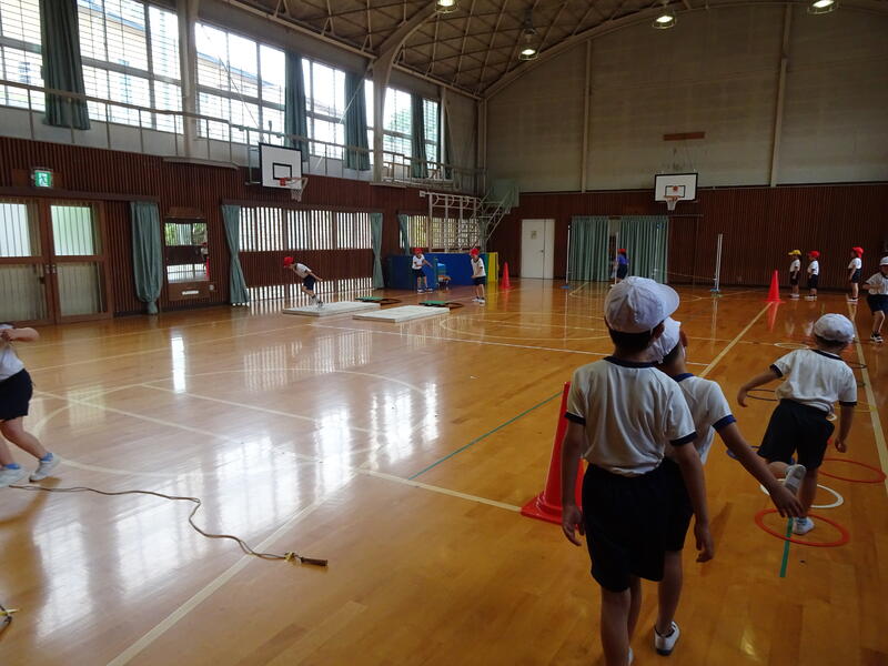 1・2年生は合同体育です。4つの場をつくり忍者修行です。