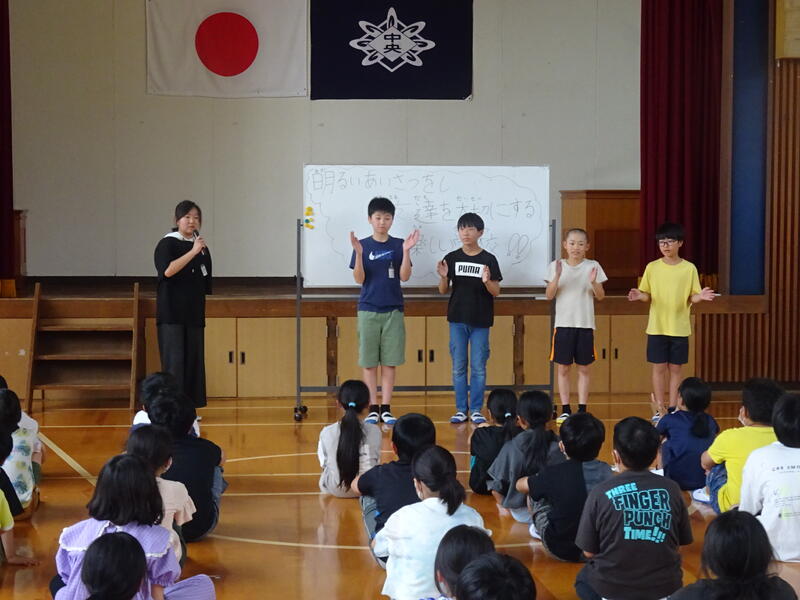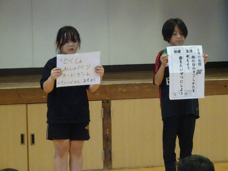 また、火曜集会では5月の月目標の反省と6月の目標です。委員会の子供たちが中心になり頑張っています。