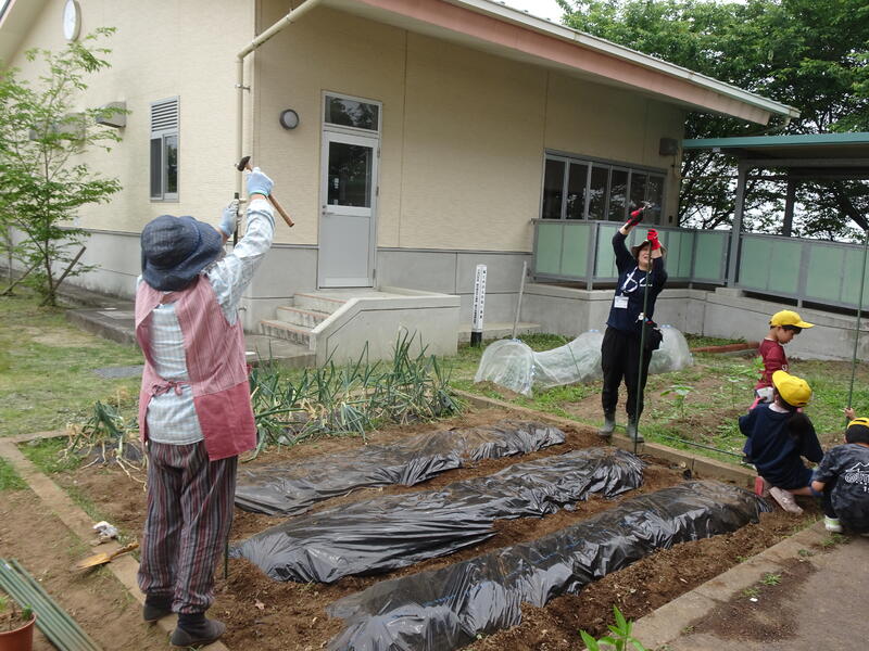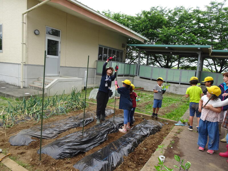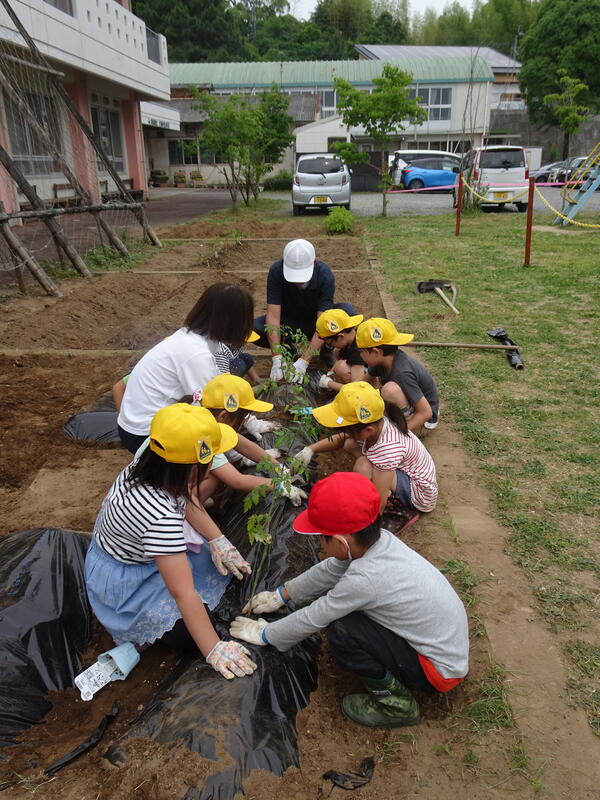 地域の方がお手伝いいただき、畝づくりもしました。1,2年生は、「早く大きくなって」と願いを込めて野菜の苗を植えました。