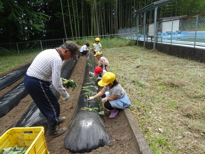 また、1年生は芋の苗もしました。一人20本と張り切って植えました。地域の方の協力で体験活動ができました。