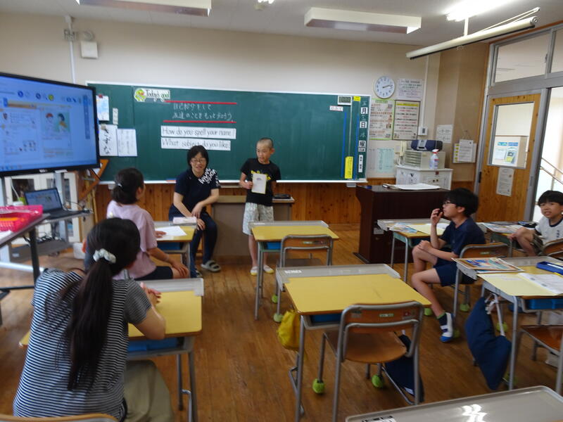 5年生の英語の時間は何と1時間、英語で授業が進んでいました。自己紹介をする友だちに、英語で質問をし、英語で答えています。またリアクションも取っています。楽しそうに英語に親しんでいる5年生です。