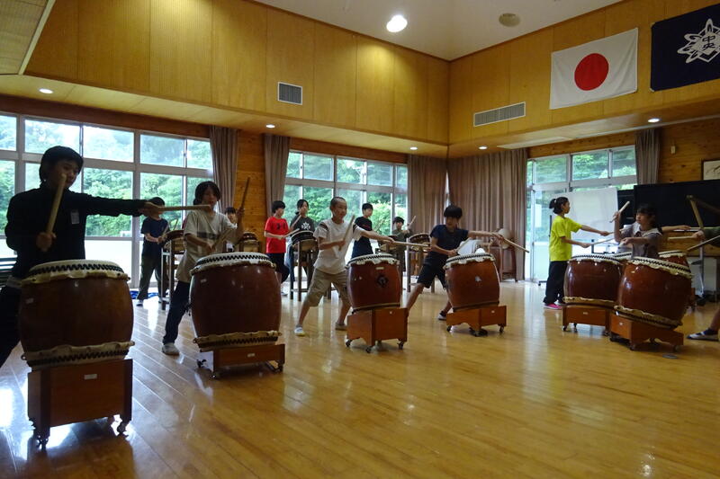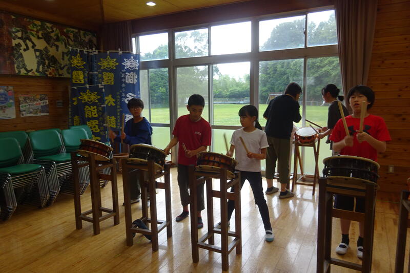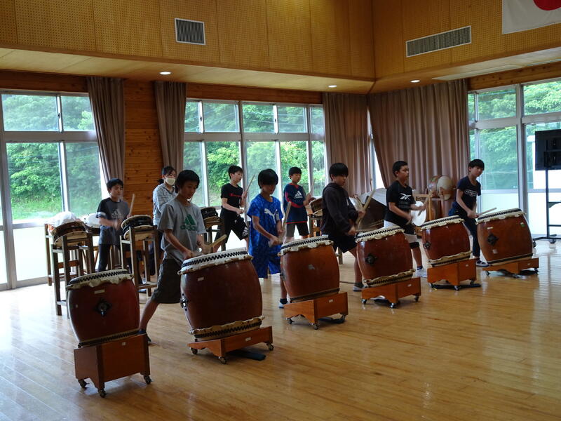 5年生は6年生に能寛太鼓の打ち方を学びました。