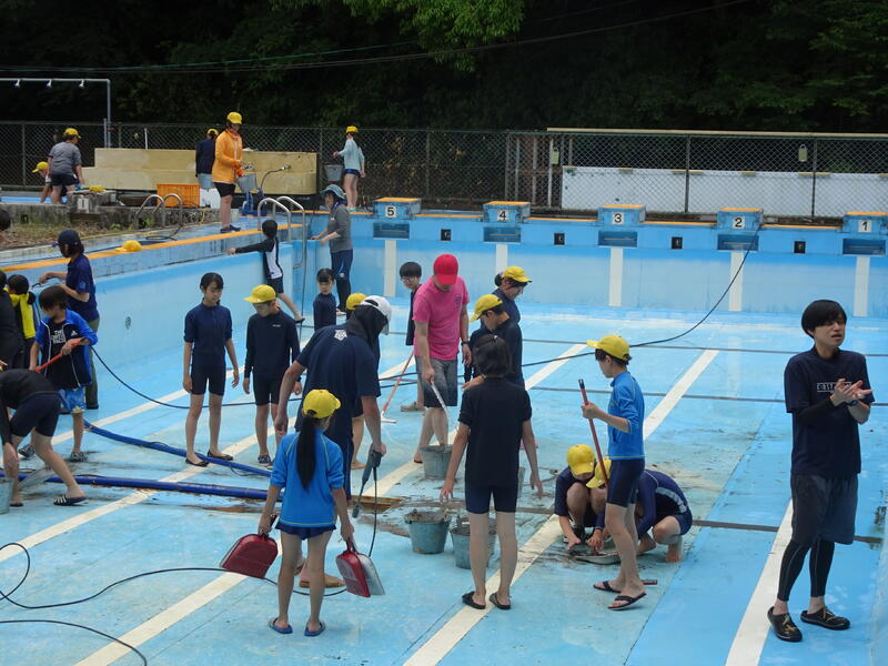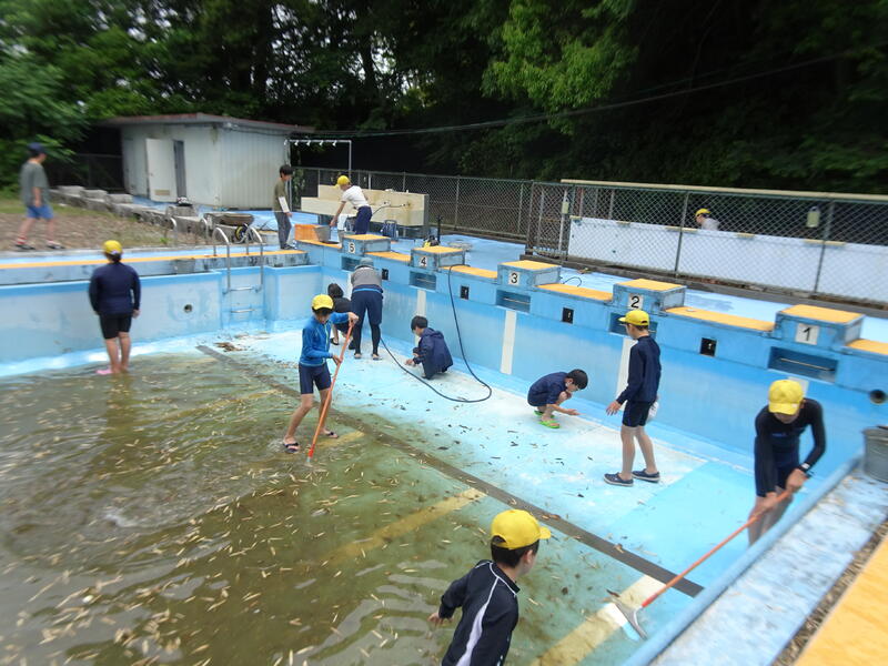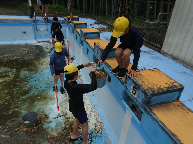 プールの落ち葉をとったり、汚れた水を出したり、壁を磨いたりとみんなよく頑張りました。おかげでプールがきれいになりました。4年生以上の皆さん、ありがとうございました。