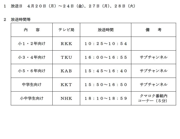 来週月曜日から、熊本市教育委員会と県内テレビ局が共同して、休校中の小中学生のためのテレビ番組「くまもっと まなびたいム」を放送します。県内全域でご視聴できます。ご家庭でも有効に活用されてください。
