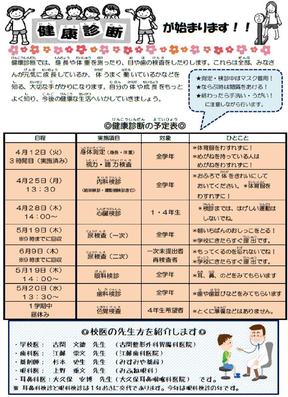眼科検診の開始時間が配布したほけんだよりから変更しております。