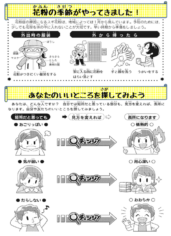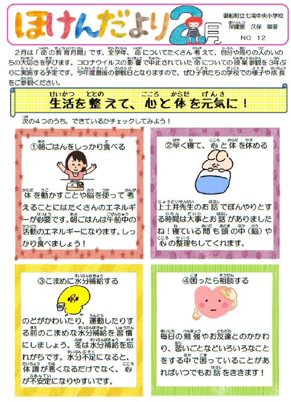 2月の保健目標「心と体を大切にしよう」にちなんで、心と体を元気にするための生活習慣や、短所を長所にする言葉「リフレーミング」について載せています