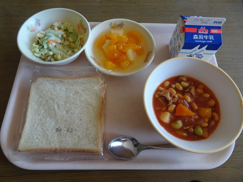 今日のメニュー :セルフサンドイッチ(食パン)ポークビーンズ、チーズサラダ、フルーツポンチ、牛乳