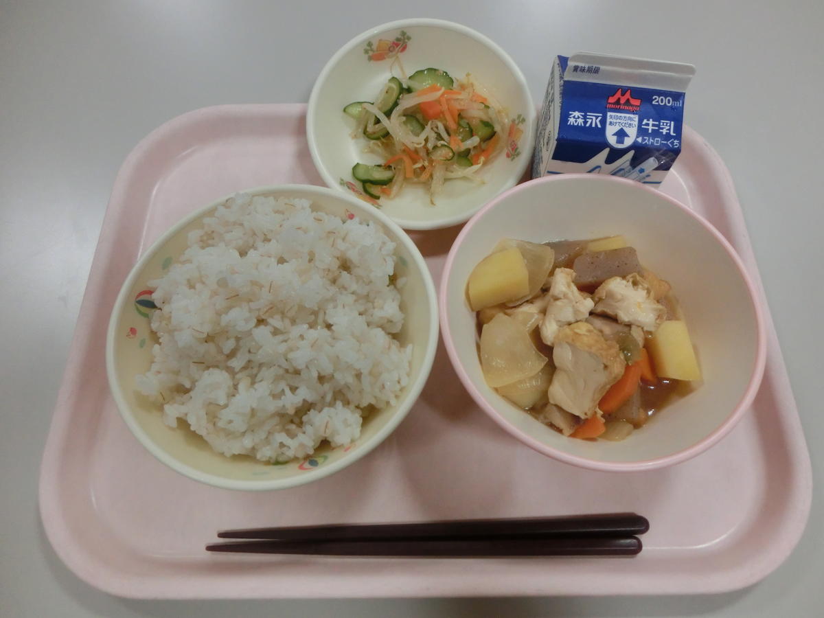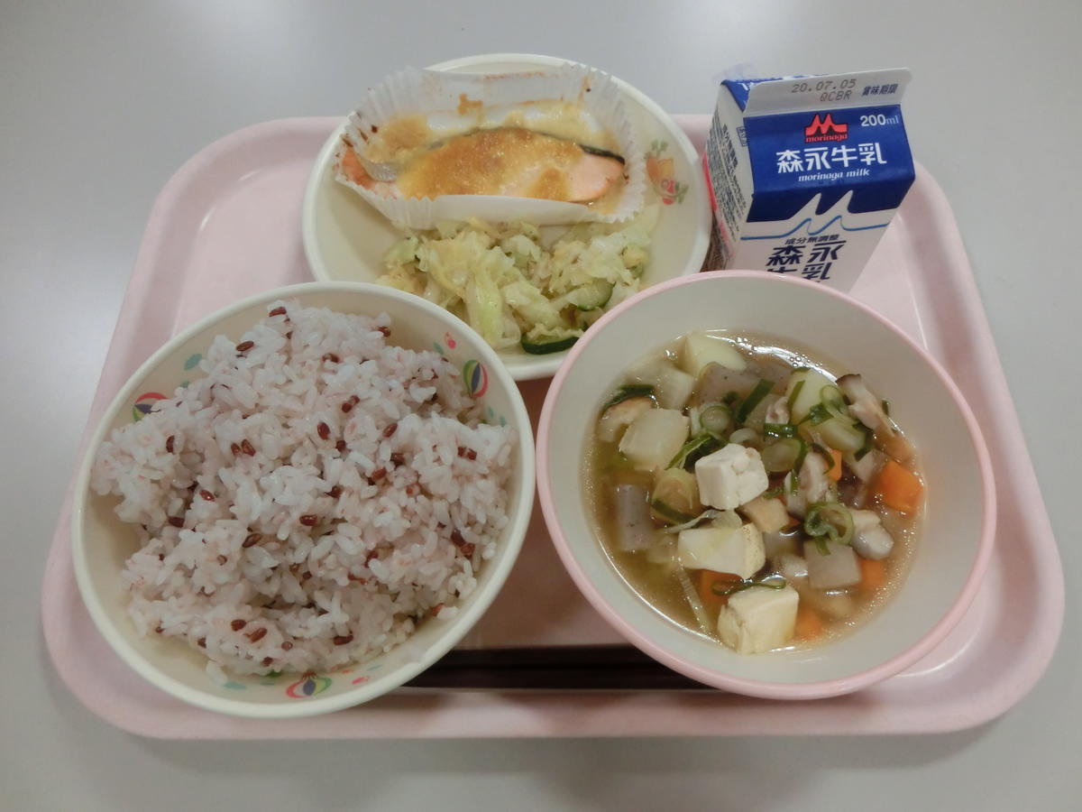 | あかまいごはん のっぺいじる さかなのみそマヨやき たくあんあえ 牛乳 |
