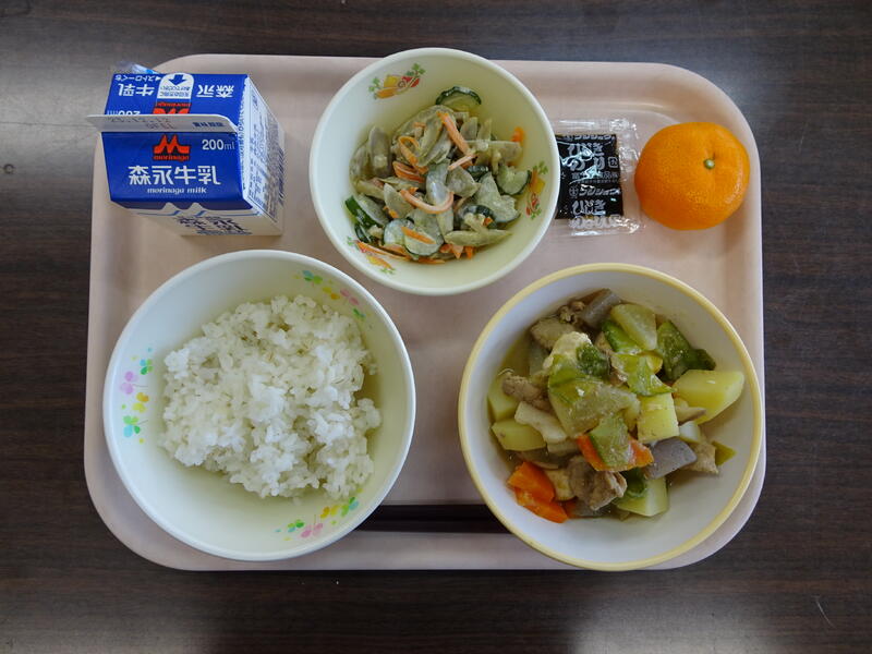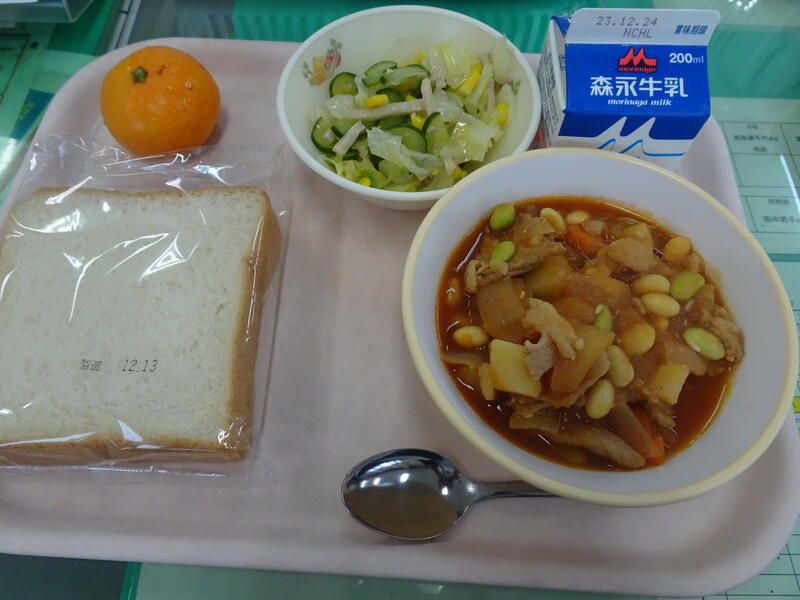※本日は、「クリスマス献立」でした。休校の心配があったので、牛乳をミカンちゃんに変更しています。