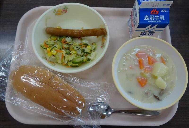 本日のお品書き:セルフドッグ(コッペパン・ウインナー)・クリームシチュー・コールスロー・牛乳