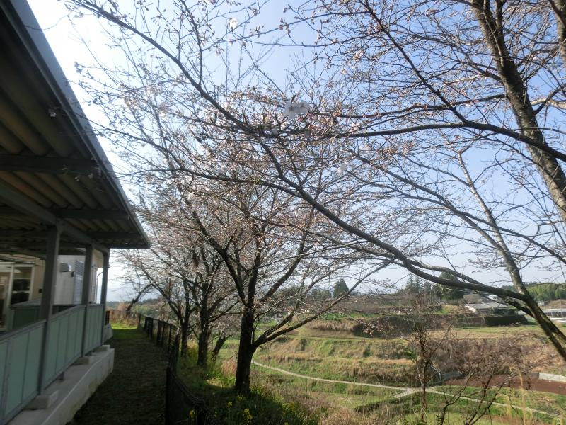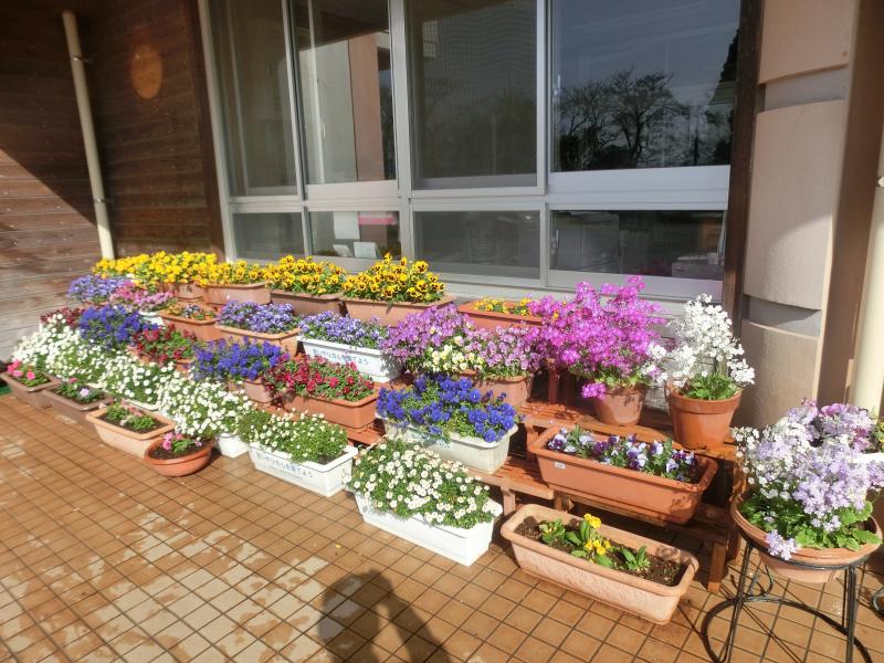 玄関前のプランター。用務員の田中君子先生が心を込めてお世話をしてくださっています。小学校の桜も咲き始めました(^^)/