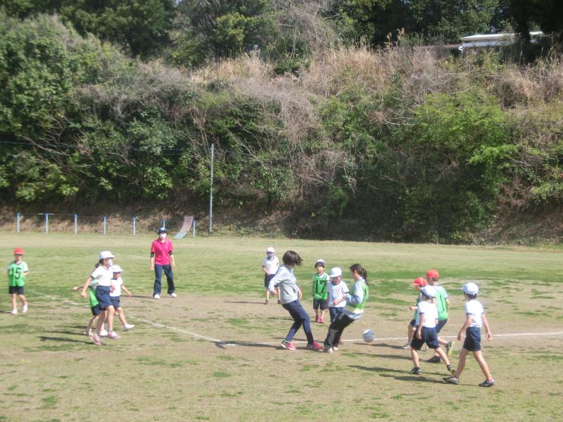 1・2年生は体育でサッカーのゲームをしていました。今日は風が冷たい日でしたが、寒さに負けずみんなボールを追いかけていました(^^)/