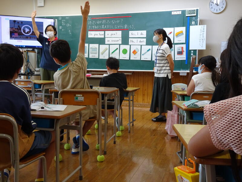 4年生は、齋賀先生と外国語活動をしました。文房具の勉強でした。外国の小学生はどんなものをもって学校へ行っているか、動画を観て学びました!!