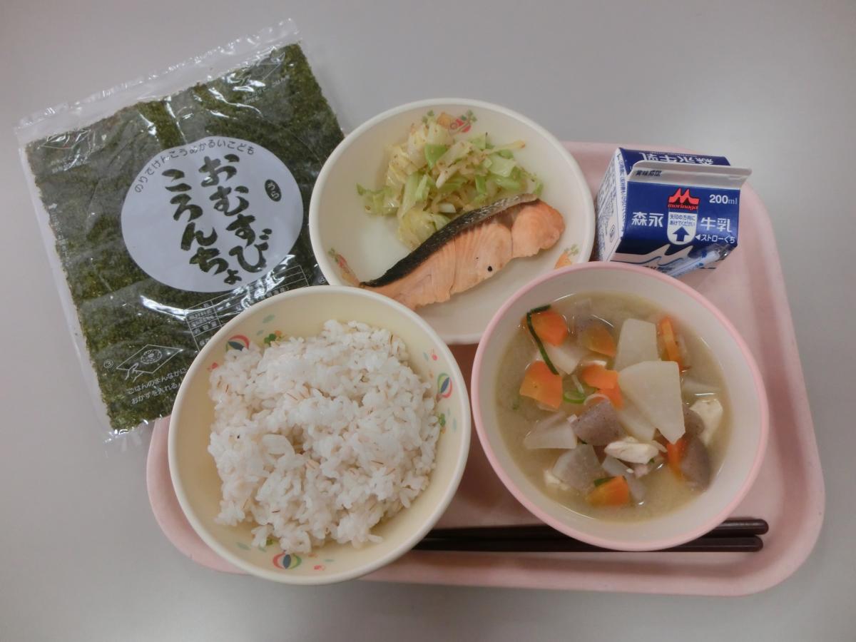 | セルフおにぎり さつまじる さけしおやき つけものあえ 牛乳 |