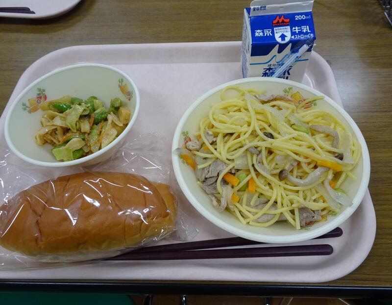 本日のお品書き:ミルクパン・スタミナスパゲティ・アスパラのごまサラダ・牛乳