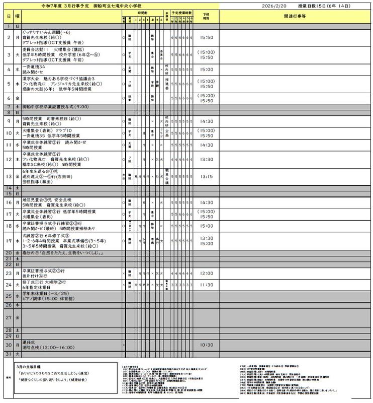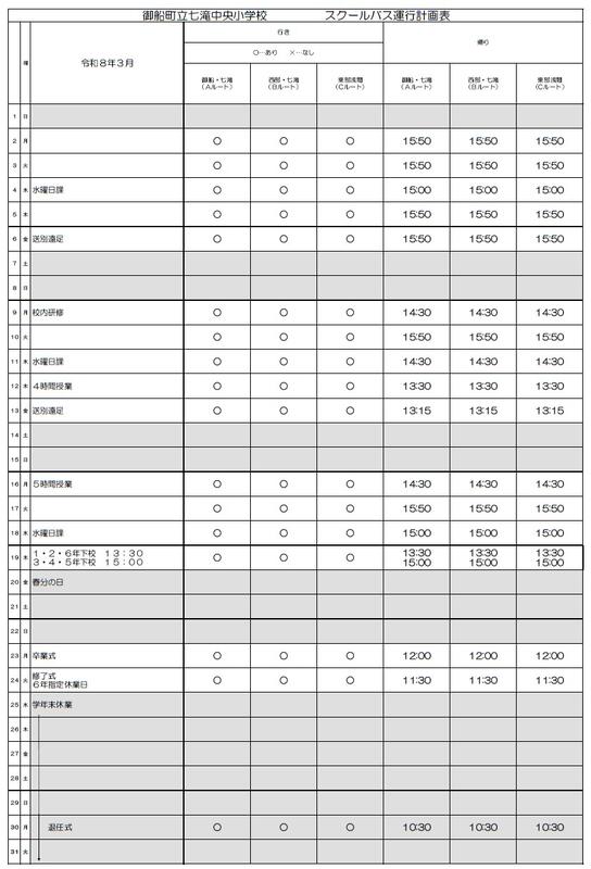 令和7年度3月行事予定表とバス予定表をアップします。