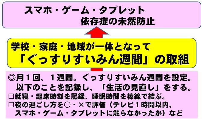 「1週間、スマホ・ゲーム・タブレットを使わないで過ごせたら、依存症ではないだろう」という仮説に基づき、月1回「ぐっすりすいみん週間」を設定。「ぐっすりすいみん週間」中は、「ぐっすりすいみんシート」に就寝時刻やスマホ・ゲーム・タブレットの使用を記録していき、実態に向き合うことで、依存症の未然防止や自己の生活改善につなげます。