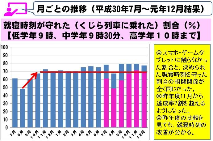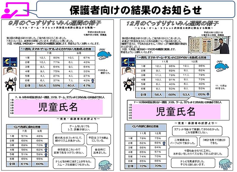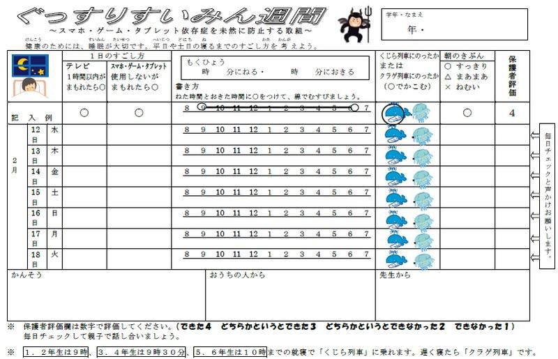 保護者からも「朝がスッキリして、学校に行くまでがスムーズ。母として助かりました。」「自らくじら列車に乗るという目標ができ、自分で考えるようになりました。」「自分で9時に布団に入り、6時に起きていました。自己管理ができてきました。」「月一回、生活習慣の見直しができて、とても良いです。」と取組は好評でした。
