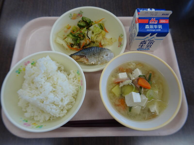 有機米ごはん、さつまいもの味噌汁、サバの塩焼き、即席漬、牛乳