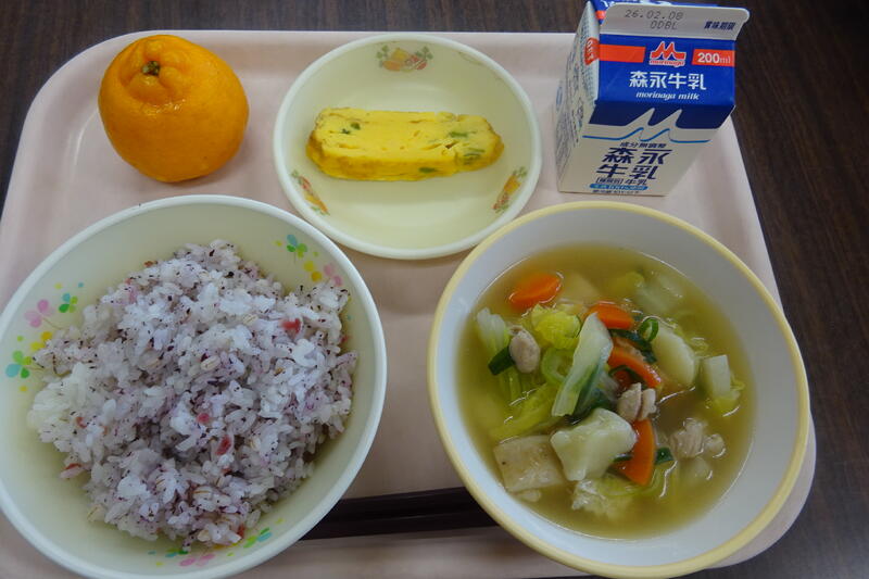 本日のお品書き:梅しそごはん・だんご汁・小松菜入り卵焼き・ぽんかん・牛乳