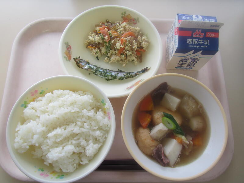 今日のメニュー :有機米ごはん、芋煮、青のりししゃも、こんにゃくの白和え、牛乳