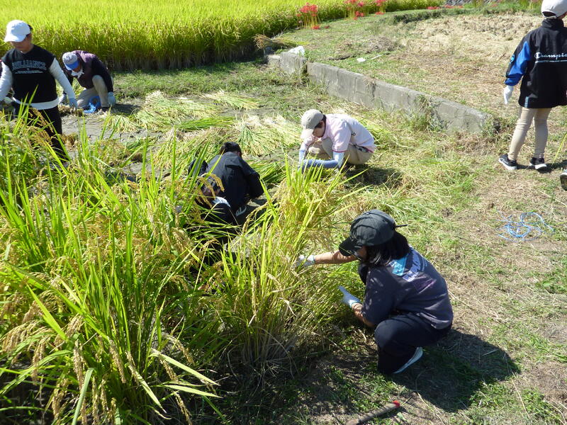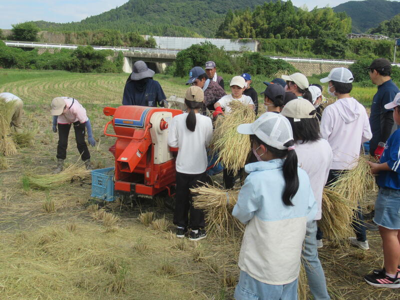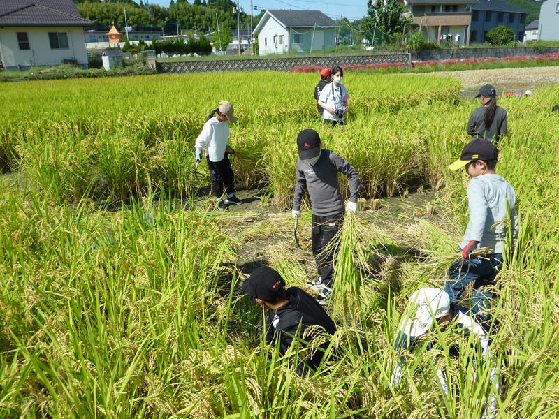 10月1日(水)午後、5年生が稲刈り体験を行いました。これまで米作りのご指導をいただいた原さんをはじめ、10名ほどお手伝いに来ていただき、無事稲刈りを終えることができました。