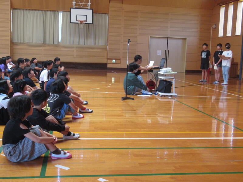 終業式終了後、6年生が考えた「10年後の南関町」について、全校児童の前で発表してもらいました。