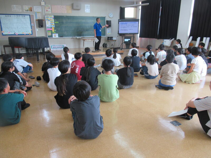 南関町教育課の方に来ていただき、本校5・6年生を対象にワークショップを開いていただきました。①クラスの人数は何人くらいがいい? ※小学校は36人以上の場合:2クラス ②クラス替えはあったほうがいい? ③未来(10年後)の小学校はどうなっていてほしい? ※校舎、クラス、登下校、授業内容 ④中学生になることの期待と不安は?などについて意見交流を行いました。