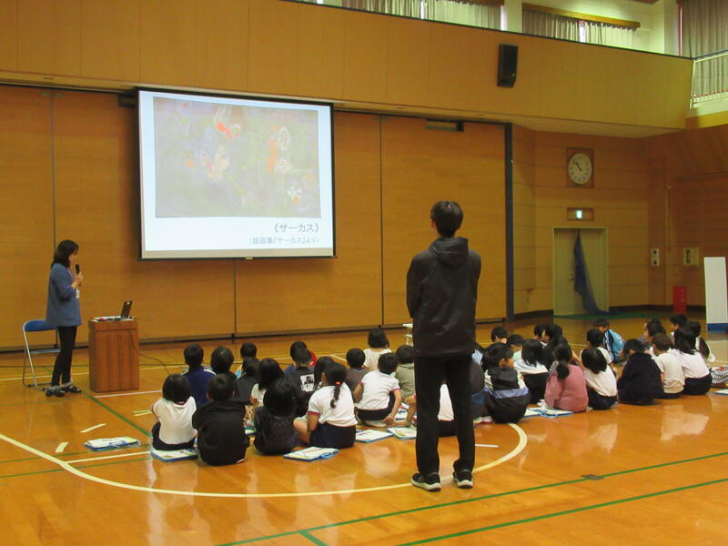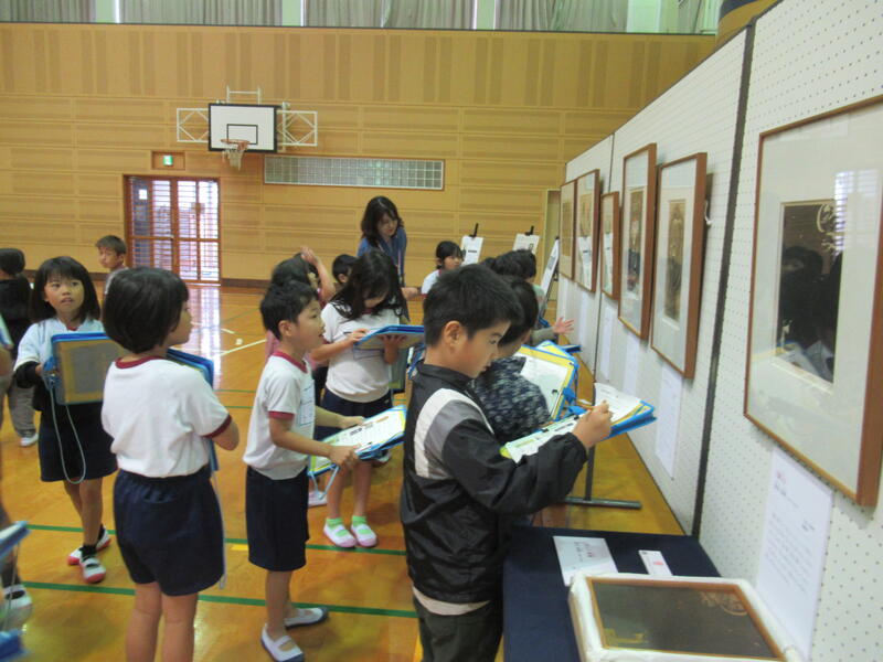 10月22日(水)に熊本県立美術館から本物の美術作品を運んで展示していただき、鑑賞学習を行いました。マルク・シャガールと浜田知明さんの作品、およそ20点を低・中・高学年ごとに、職員の方の説明を受けた後で実際に作品の鑑賞をしていきました。本物の作品に出会う貴重なひとときとなりました。昼休みの時間帯には、一般の方もご観覧いただくことができるよう防災無線でご案内していましたが、当日は10数名の方にお越しいただきました。