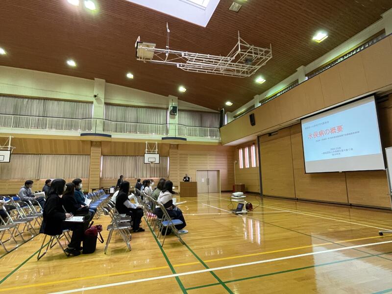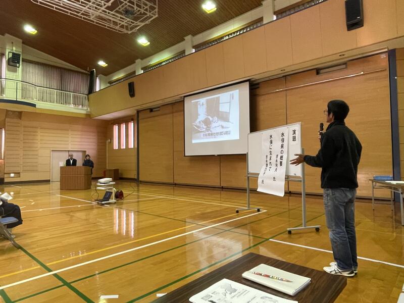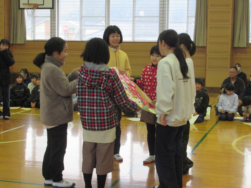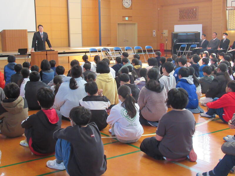 終業式終了後、6年生が考えた「10年後の南関町」について、全校児童の前で発表してもらいました。